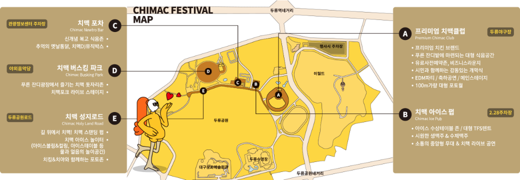 대구 치맥페스티벌은 총 5곳의 장소에서 개최됩니다. 대구 두류공원 내 총 5개의 페스티벌 베뉴가 마련되는데요. 도보로 이동 가능한 거리입니다. 아래 지도를 볼까요.