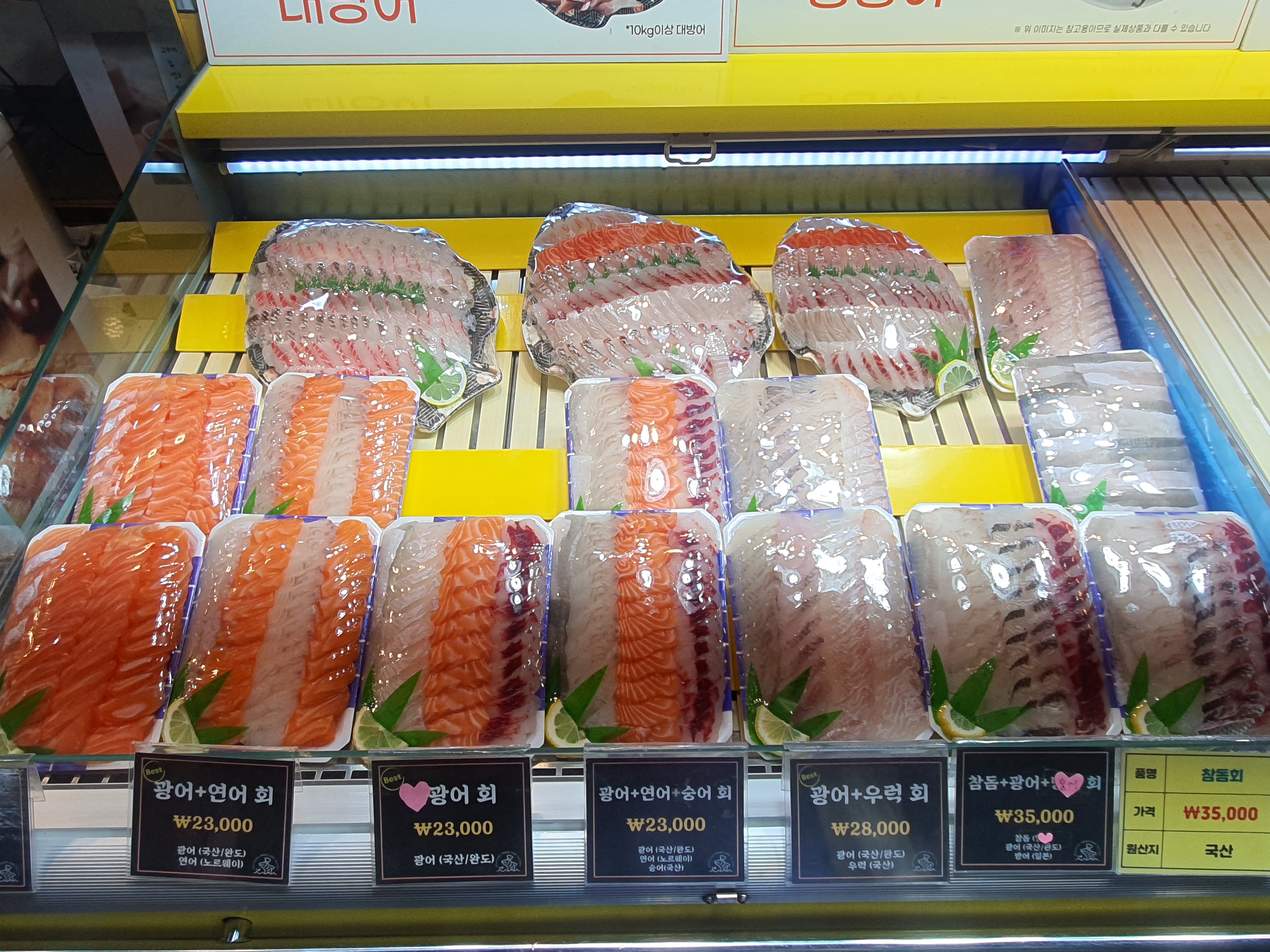 광어와 우럭, 연어, 숭어, 참돔까지 한국인들이 좋아하는 회들이 가지런히 놓여 있다. 가격이 매우 저렴하다. 한 팩만 구입해도 2인이 적당히 반주 삼아 먹을 수 있는 양이다. 광어회 23,000원, 광어+연어회 23,000원. 광어+연어+숭어회 23,000원 광어+우럭회 28,000원 참돔+광어+숭어회 35,000원 참돔회 35,000원. 대부분 국산이다. 혜자로운 망원시장의 횟집.