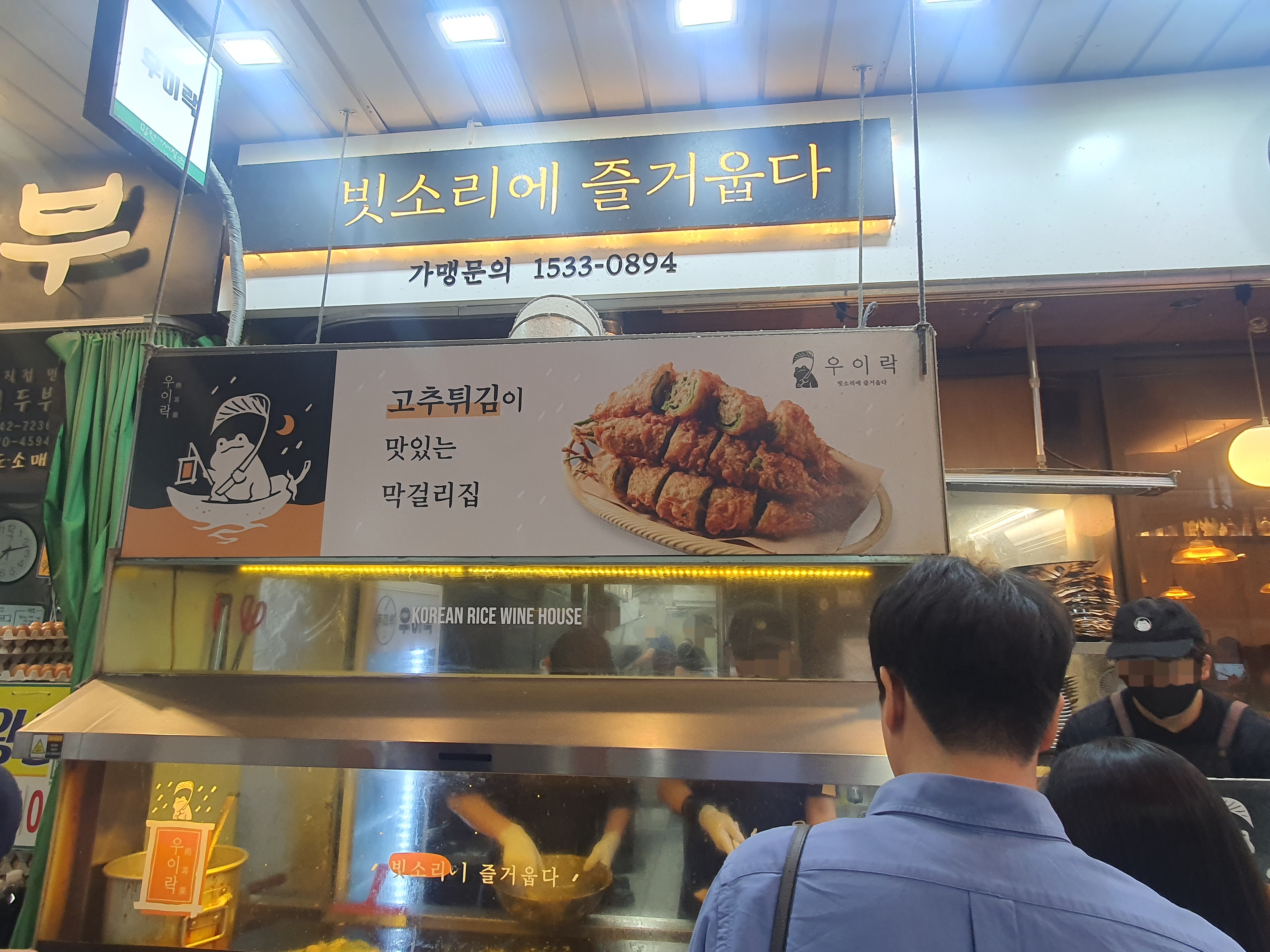 #우이락 막걸리와 고추튀김의 조합. 테이크아웃 손님도 매장 손님도 넘쳐난다.