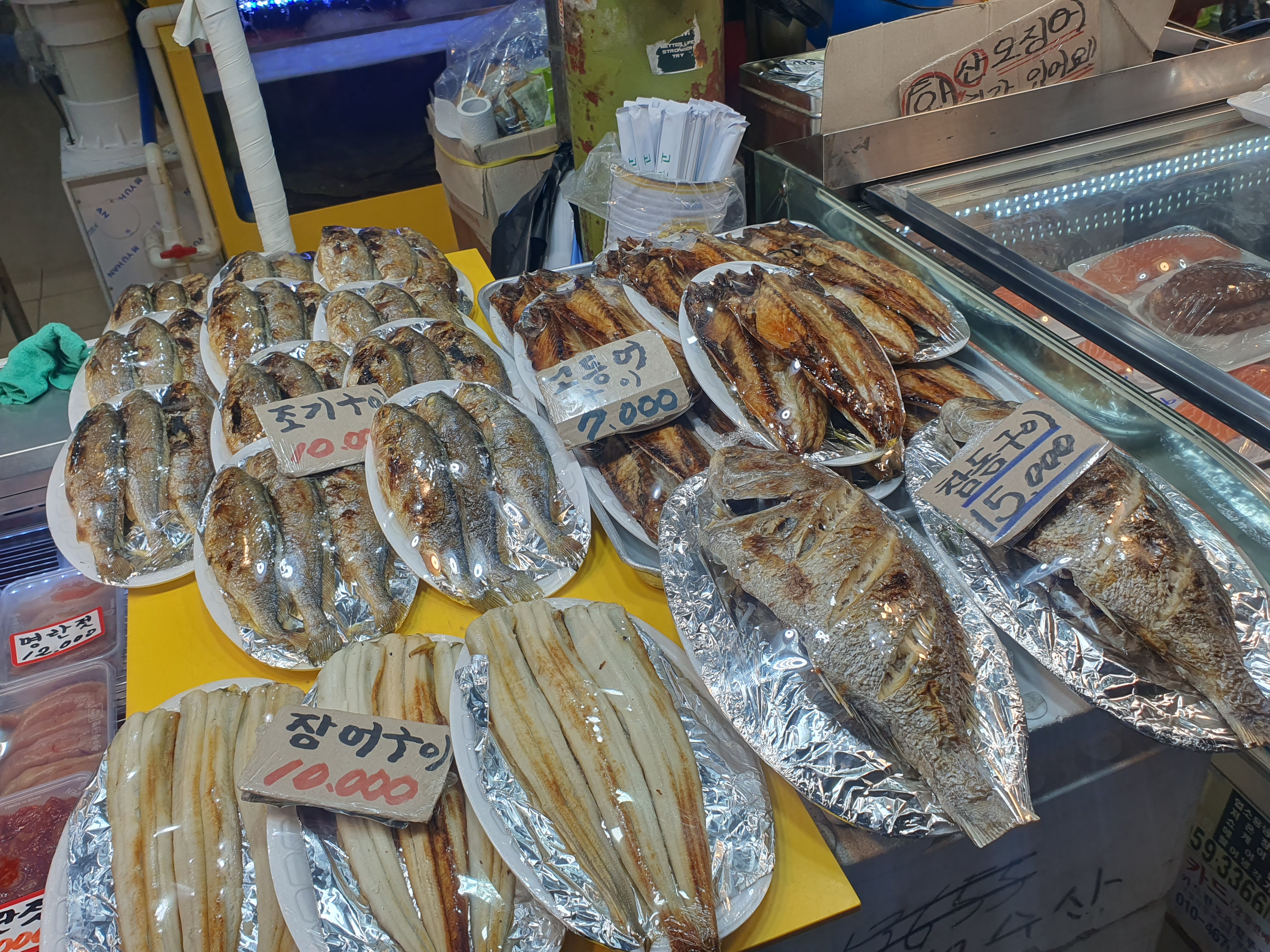 맙소사. 장어구이 3피스에 10,000원 참돔구이 1마리 15,000원 조기구이 3마리 10,000원 고등어구이 2마리 7,000원. 생선 고프다.