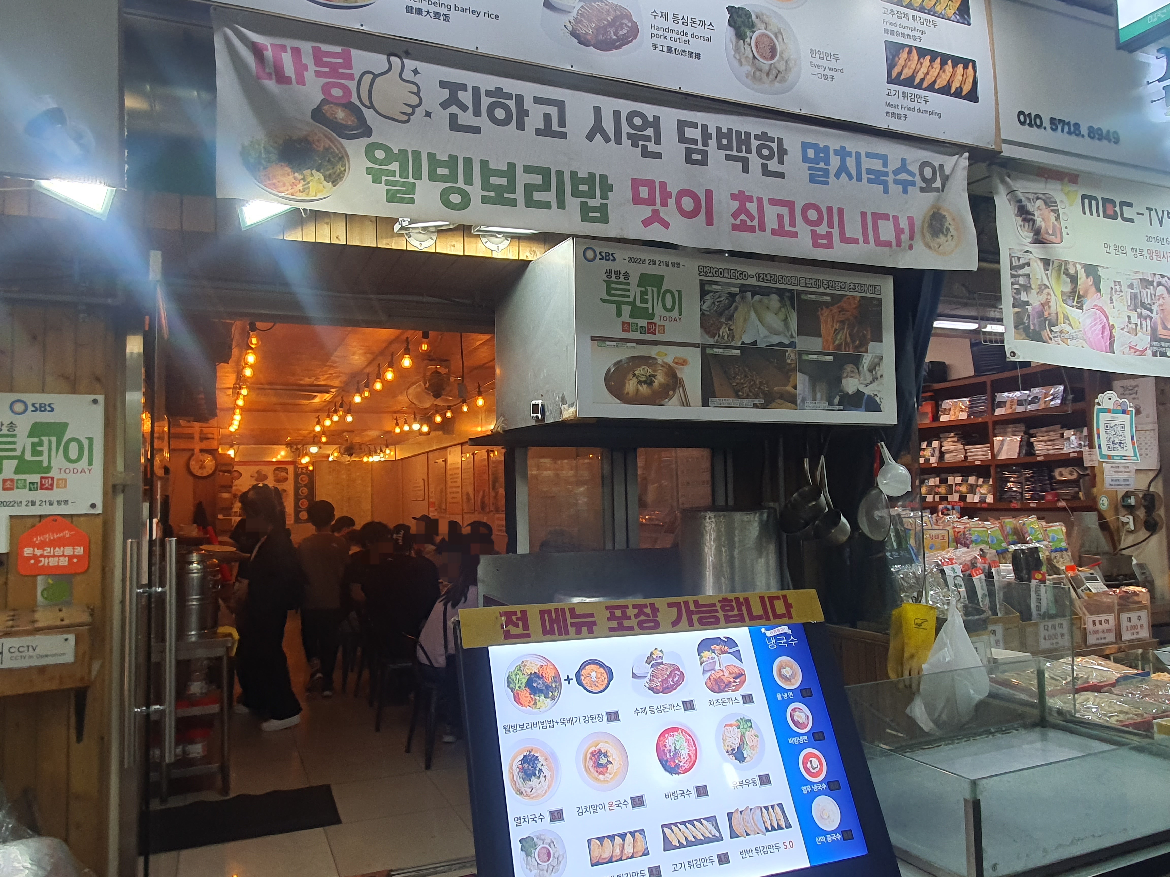 보리비빔밥과 뚝배기 강된장, 등심돈까스, 멸치국수, 김치말이 온국수, 유부우동, 튀김만두 등 한끼 식사와 사이드 메뉴가 보기 좋게 어우러진 식당이 눈에 띈다. 테이블은 젊은이들로 가득 차 있다.전 메뉴 포장도 가능하다.