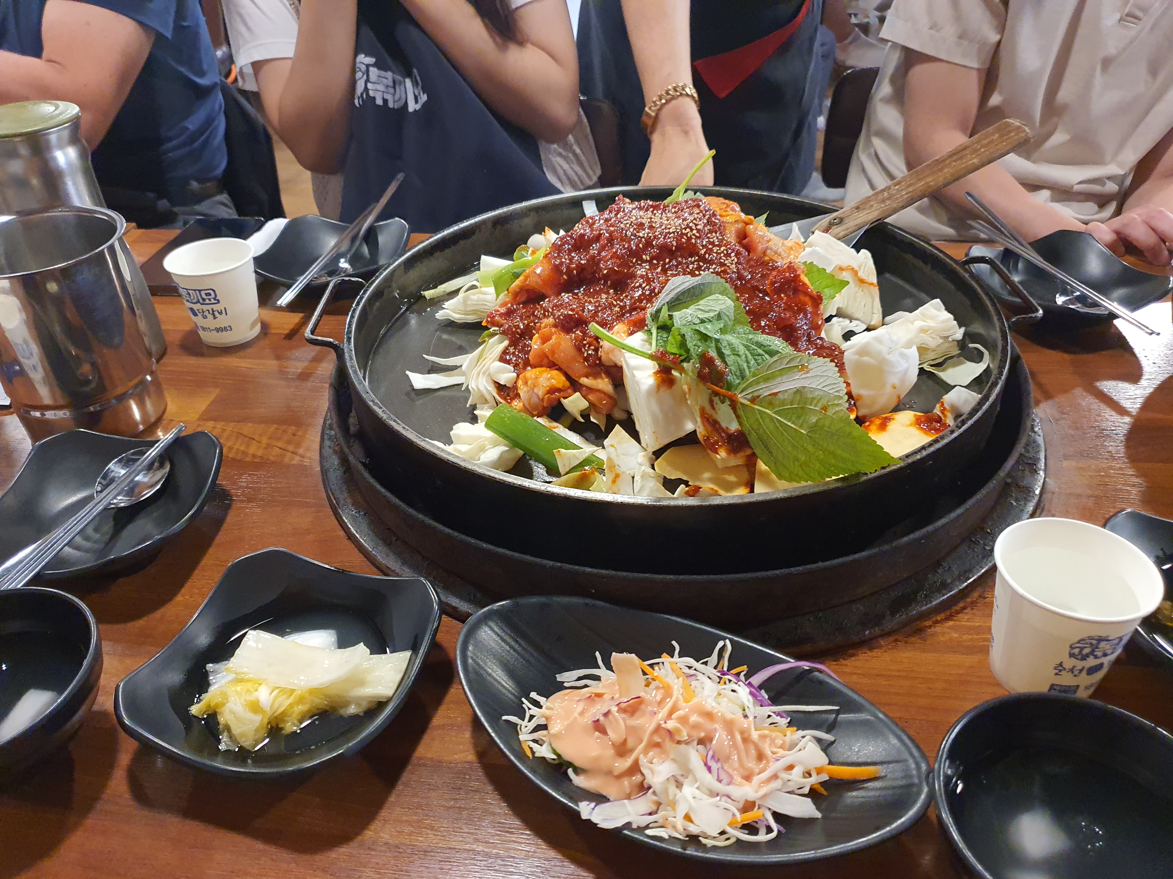 짜쟌! 드디어 닭갈비가 나왔어요. 사진으로 잘 표현이 되었을까요? 실제로는 꽤 푸짐하게 상을 가득 채웠답니다. 보기만 해도 먹음직스러워요. 안동에서 춘천닭갈비를 먹을 수 있다니! 행복합니다 ㅎㅎㅎ