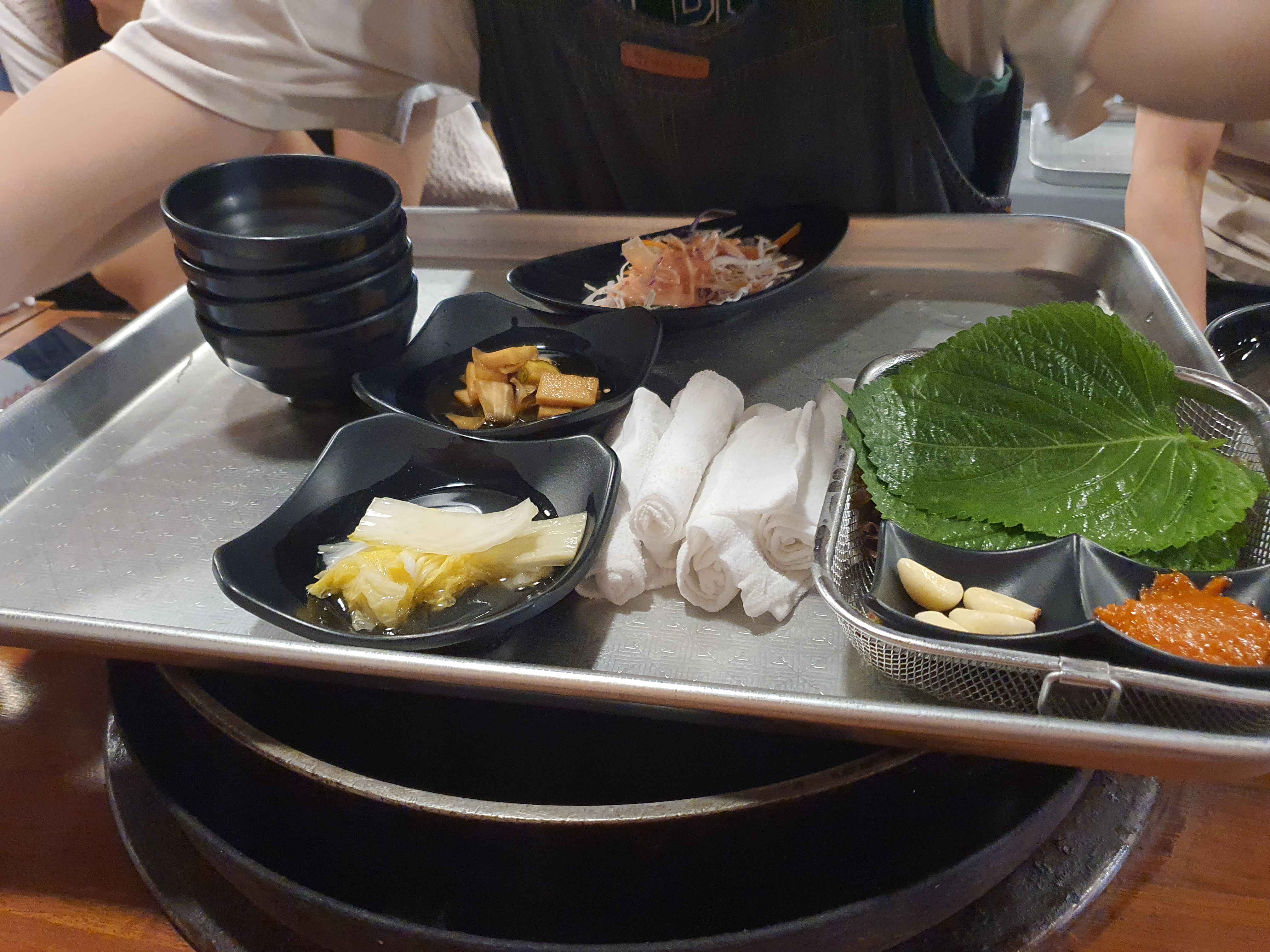 기본찬이 나옵니다. 깻잎과 상추 등 야채와 백김치 샐러드, 무장아찌가 나오는군요. 닭갈비와 잘 어울리겠어요. 물티슈로 손을 닦아주면서 직원분이 닭갈비를 가져다주시길 기다립니다.