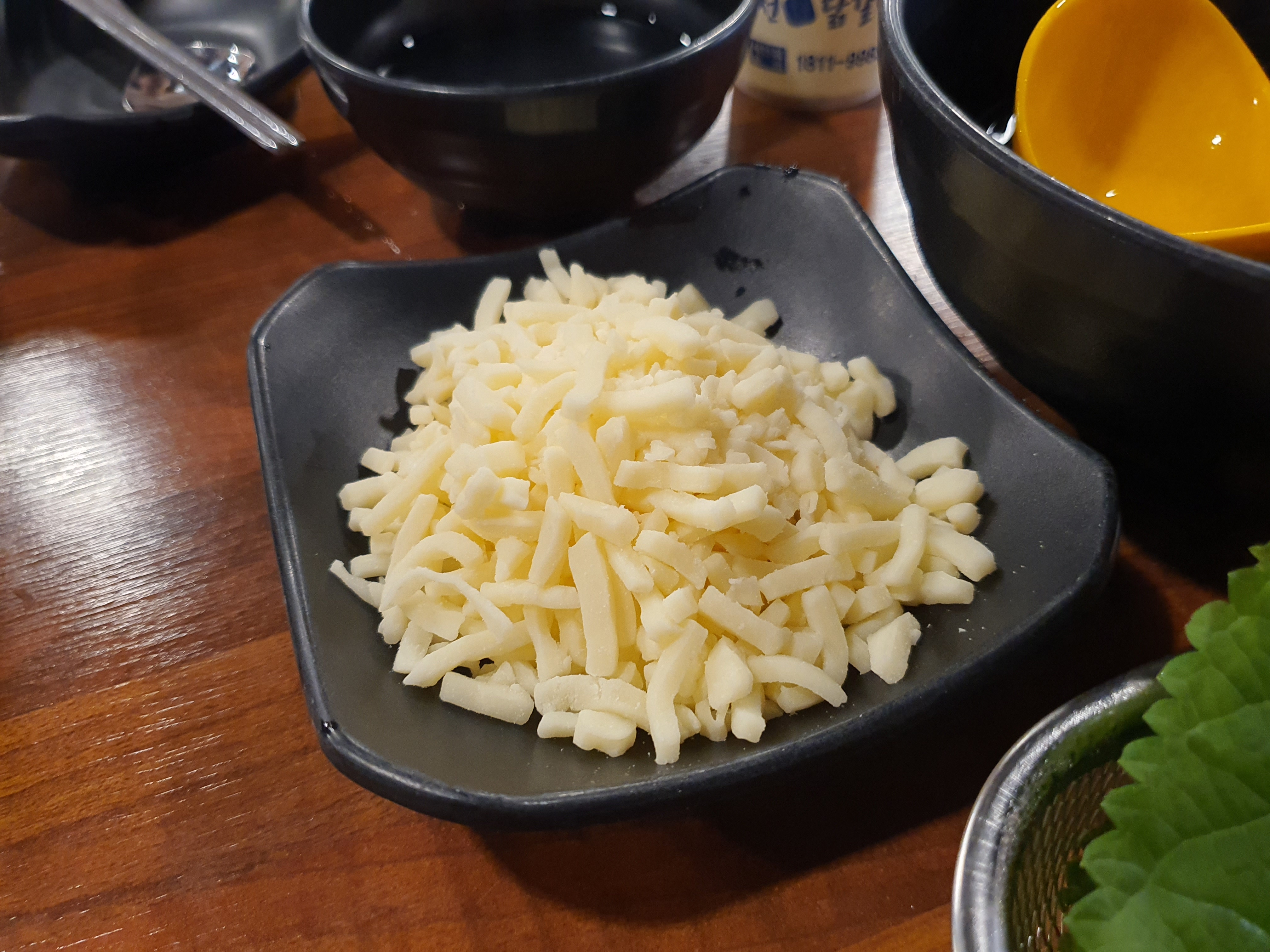 치즈는 추가주문 해주었어요. 닭갈비를 다 볶고나면 닭갈비 위에 올리거나, 팬 중앙에 자리를 내서 치즈를 넣고 녹여줄 수 있어요. 저희는 후자! 치즈를 따로 중앙에서 녹혀서 닭갈비에 조금씩 얹어서 먹었답니다. 꿀맛 ㅠ