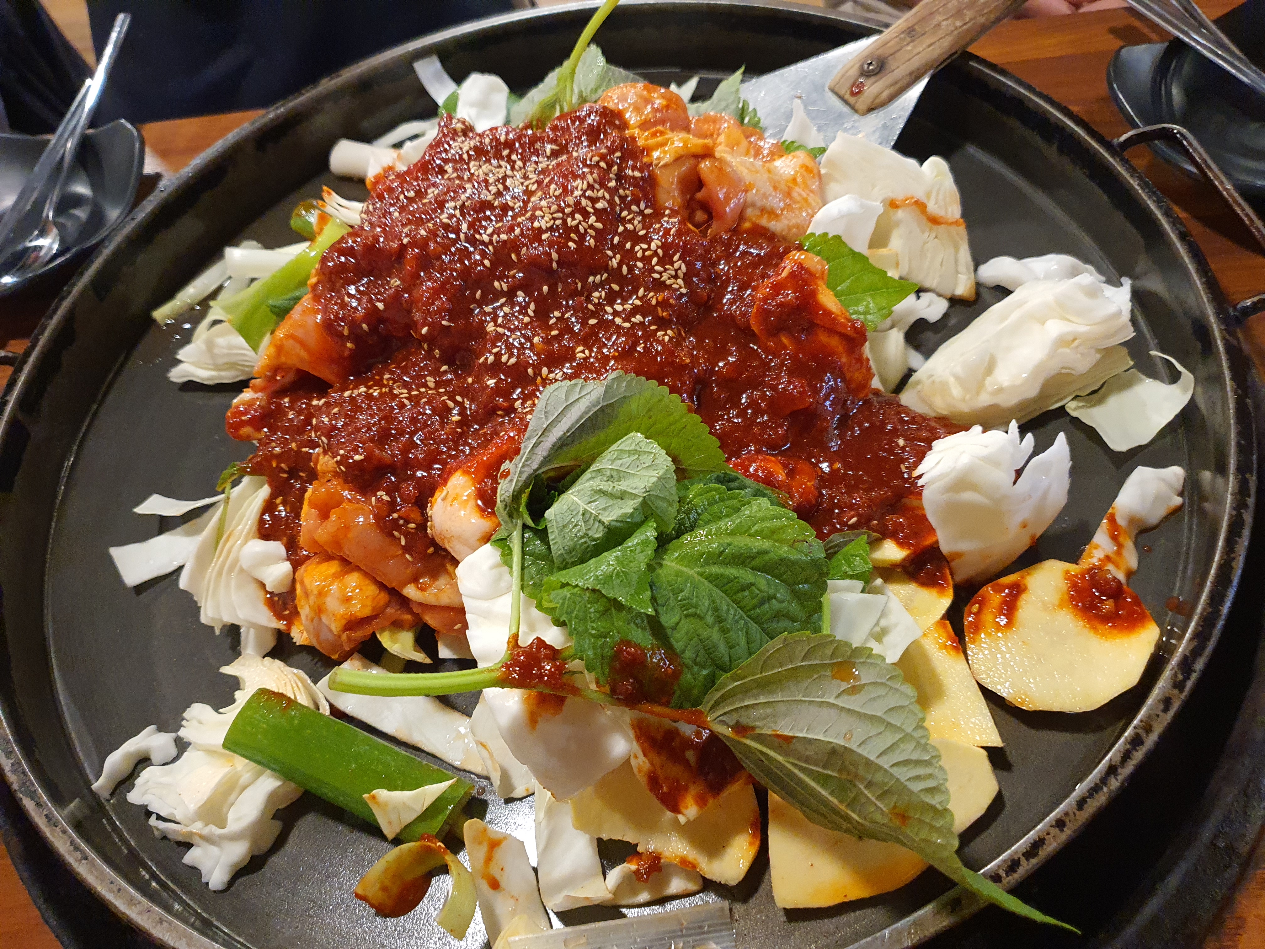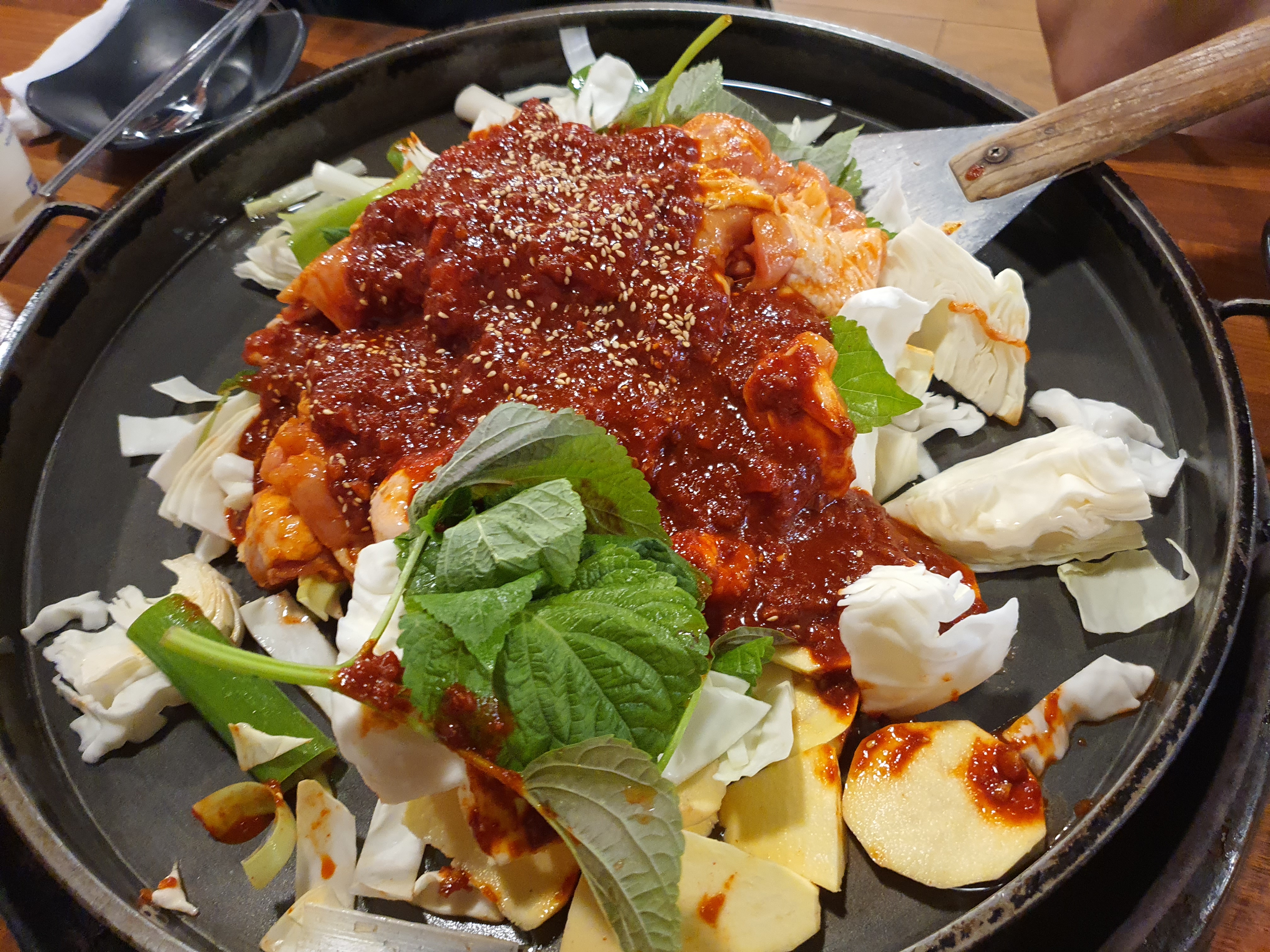짜쟌! 드디어 닭갈비가 나왔어요. 사진으로 잘 표현이 되었을까요? 실제로는 꽤 푸짐하게 상을 가득 채웠답니다. 보기만 해도 먹음직스러워요. 안동에서 춘천닭갈비를 먹을 수 있다니! 행복합니다 ㅎㅎㅎ